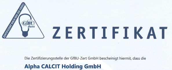 Alpha Calcit ist zudem DIN ISO 9001 und DIN ISO 50001 zertifiziert.